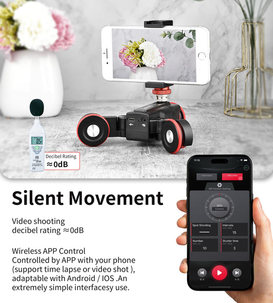 Camera Slider Dolly 【Upgraded Version】 Silent Movement 0-100 Speed Motorized Camera Slider Car with APP Control, Video Mode & Time Lapse Compatible with DSLR Camera, Camcorder, Gopro and Phone