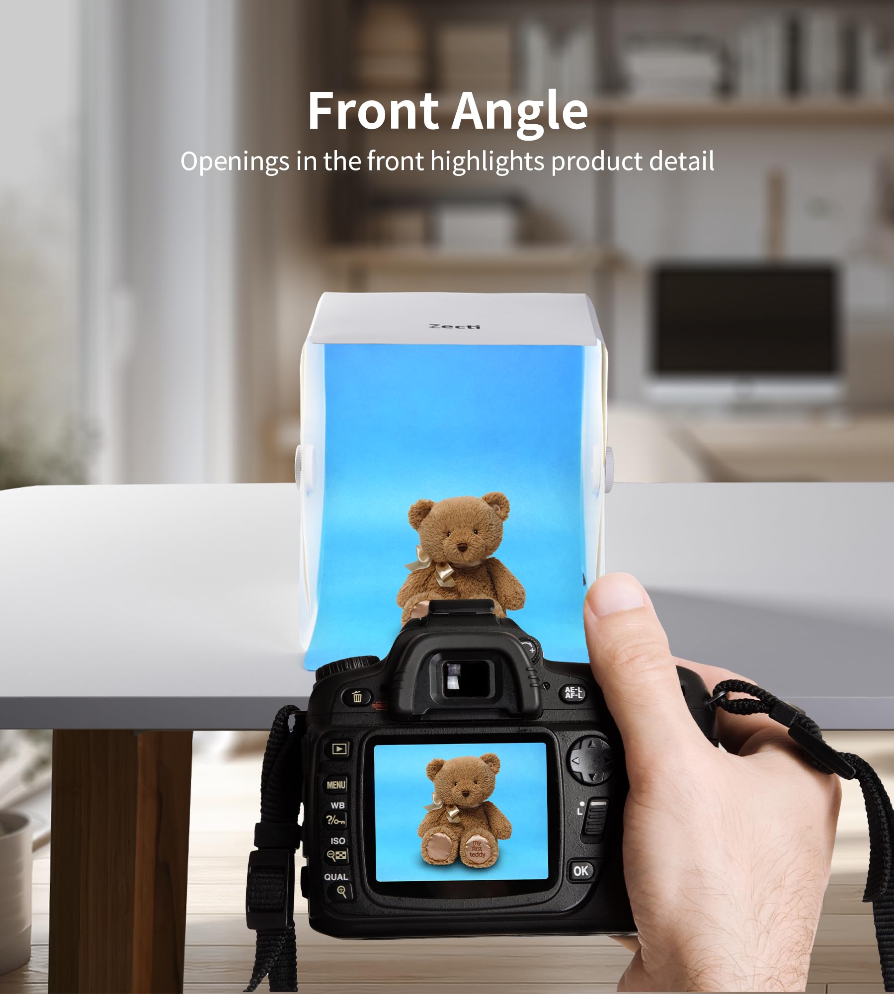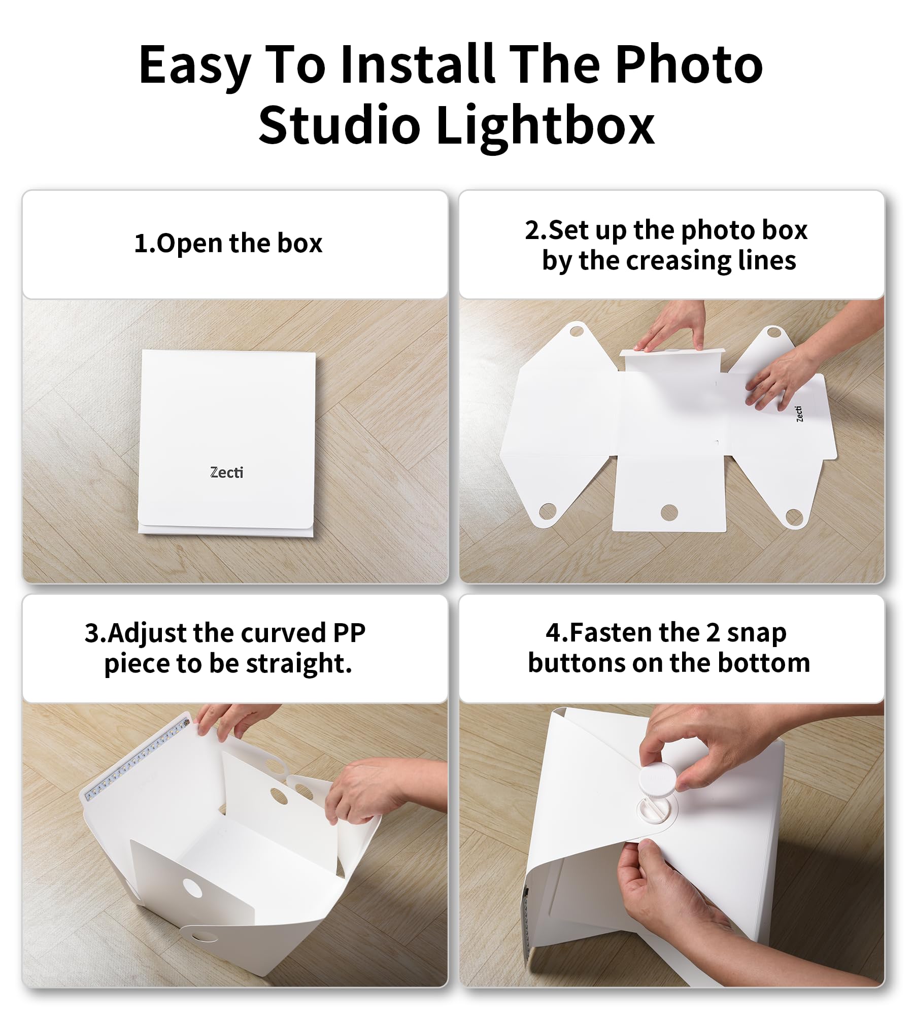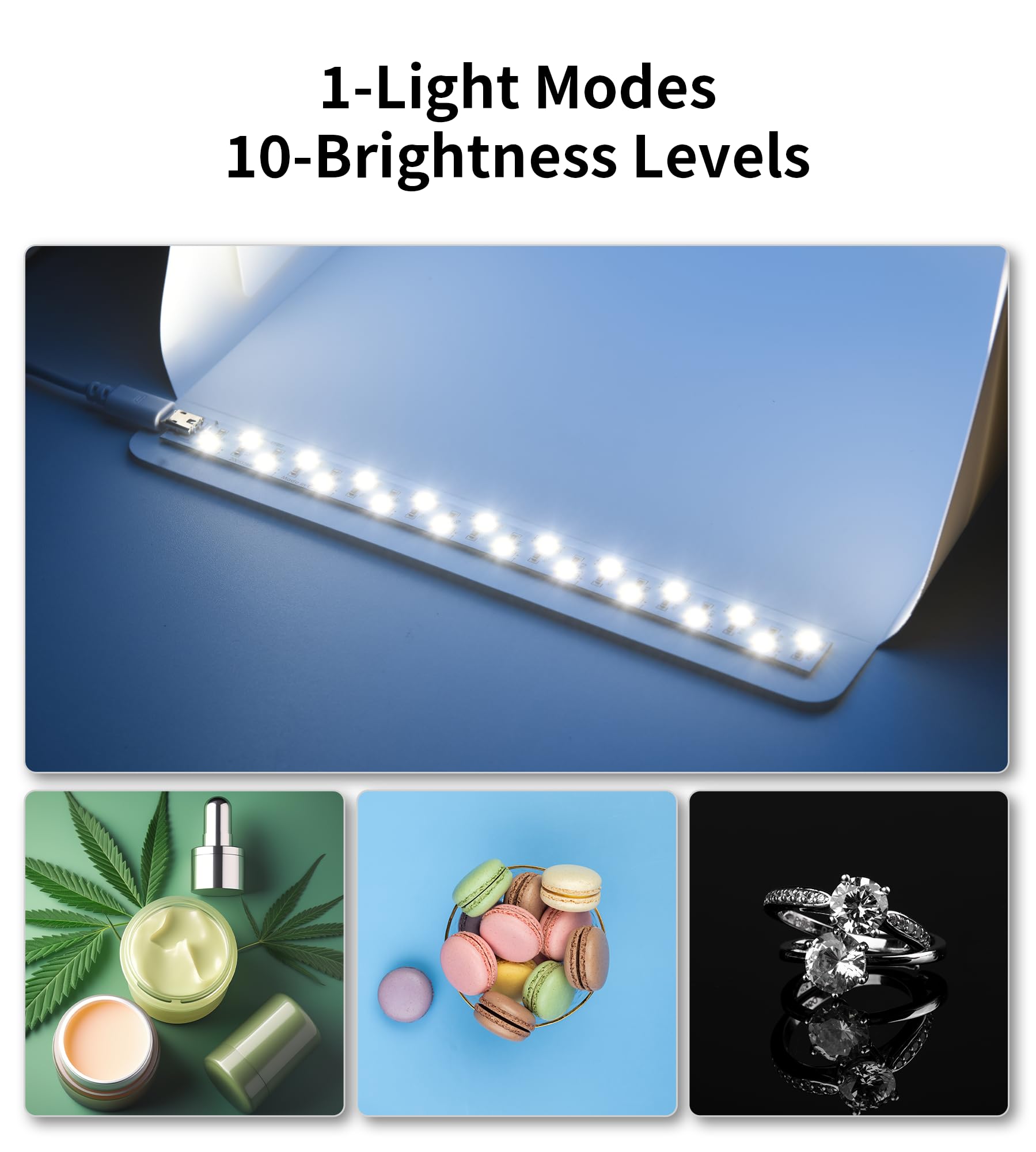 - 【Easy to Assemble】 Bond the side Velcros, then connect with a power bank, computer or AC charger, get a mini photo tent instantly. The unfolded size is 8*8*8, only support small items photography.