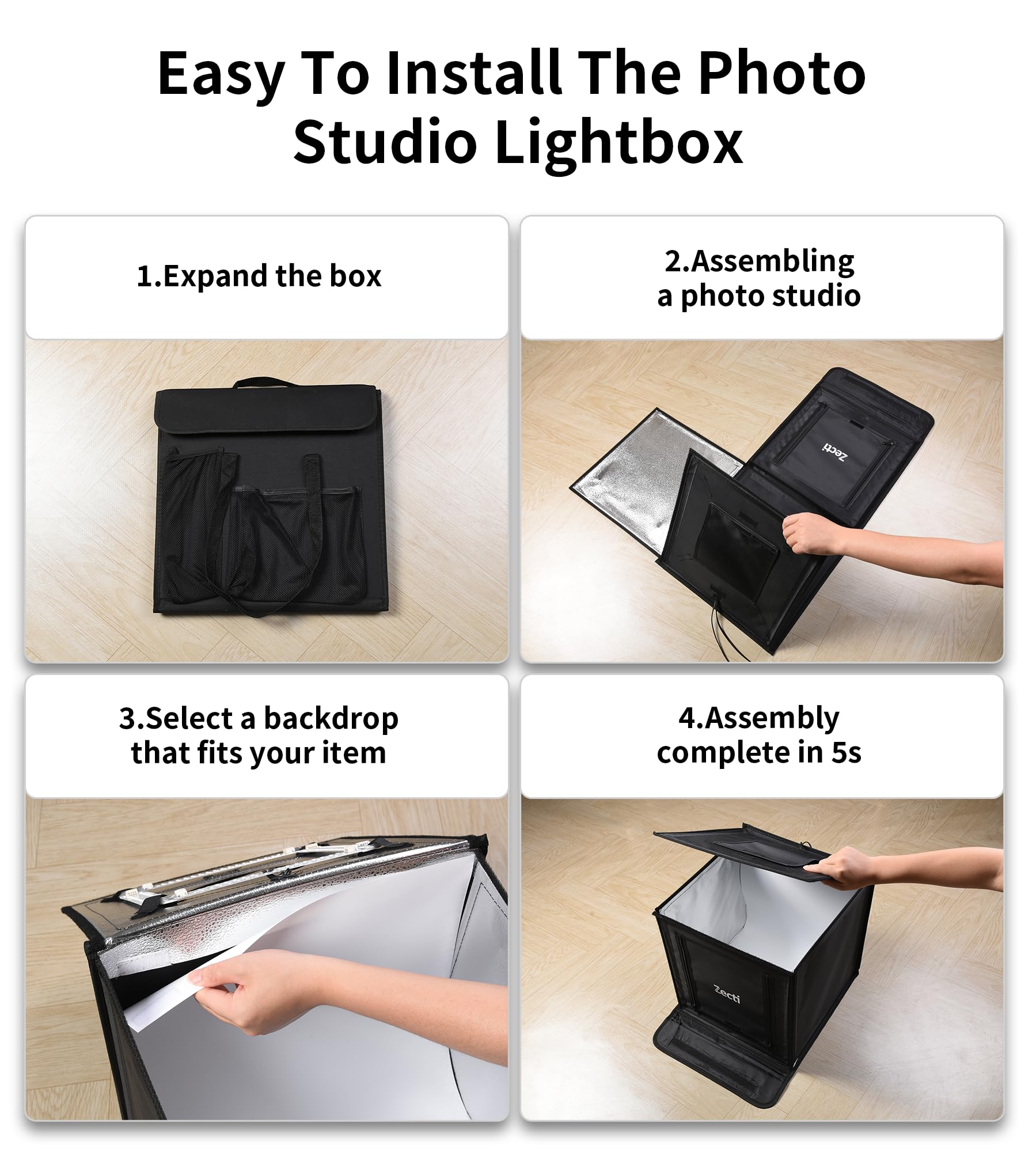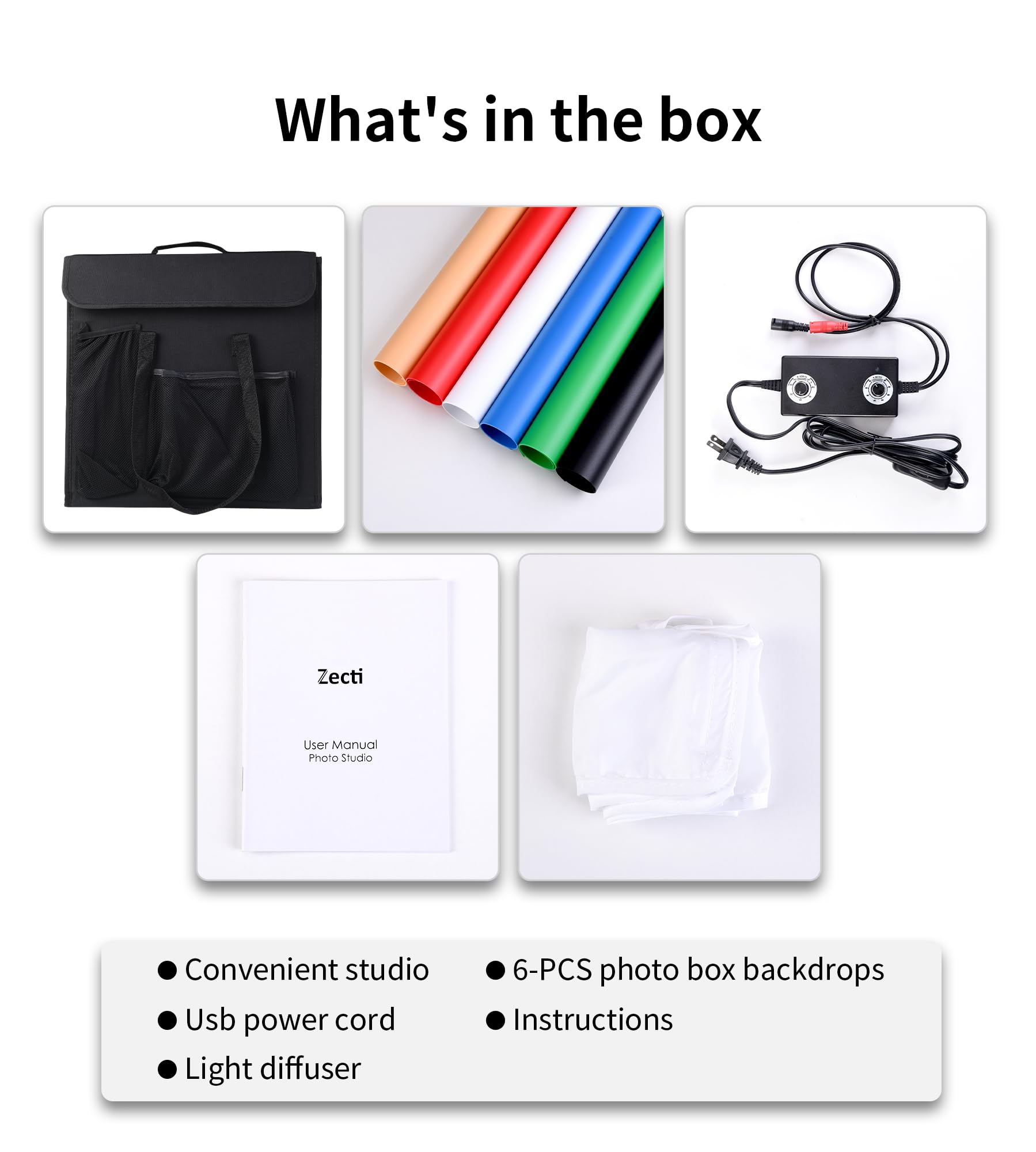 - 【What You Get】Zecti light box; Instruction manual; Charging cable; 6 color background ; Fixing screws. Friendly Customer Service. For 30 days after the date of purchase, receive a full refund guarantee for any reason. 12-month warranty for quality-related issues.